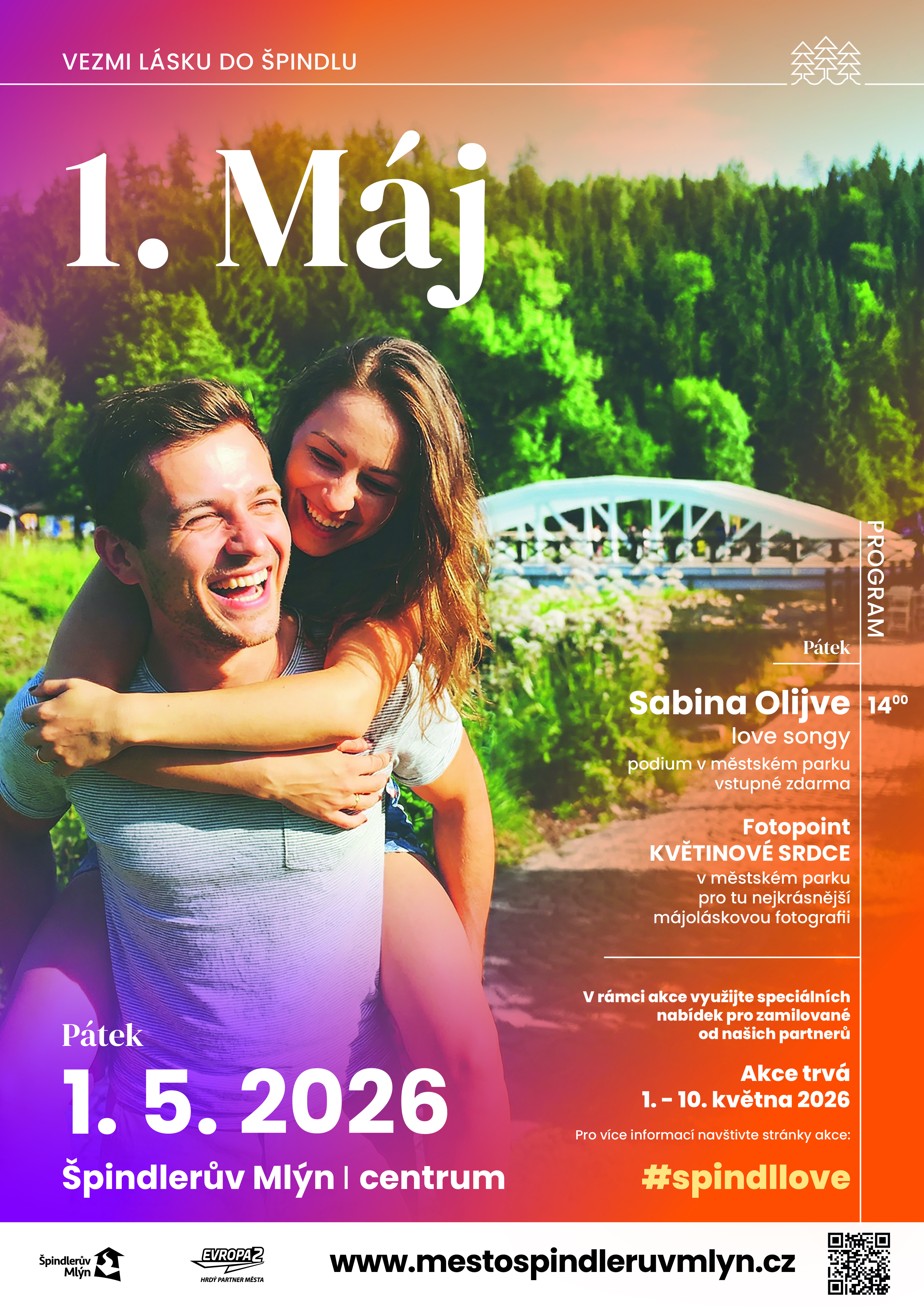 Maj, czas miłości. Dotyczy to również nas, Szpindlerowego Młyna. Zabierz swoją ukochaną osobę w romantyczną podróż do Szpindla, przejdź się po Majowym Białym Moście do parku, aż do kwiatowego serca. Stąd rozpościera się najbardziej romantyczny widok na wspólne majowe zdjęcie miłosne. Posłuchaj aksamitnych tonów miłosnych piosenek z ust piosenkarki Sabiny Olijve i ciesz się swoją #spindllove tu i teraz.